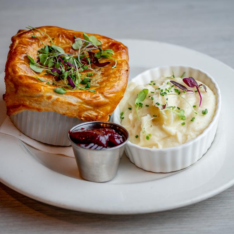 Mashed & fingerling potato, pearl onion, vegetables, savory beef gravy.