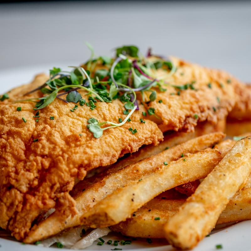 Crispy haddock, wasabi slaw, tartar sauce, lemon, fries.