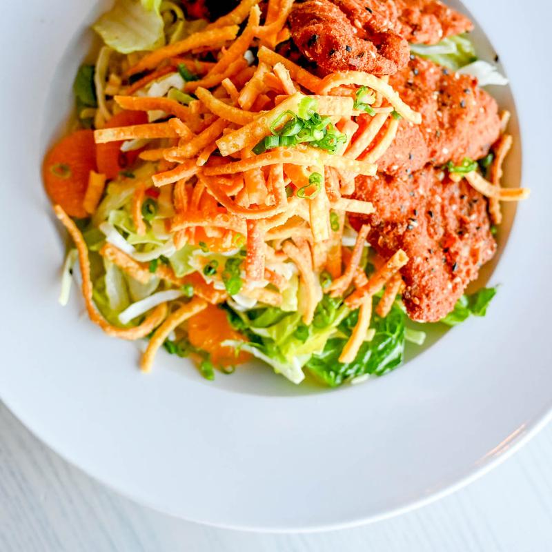 Crispy sesame chicken, romaine, shredded cabbage, fried wontons, mandarin oranges, sweet ginger dressing.